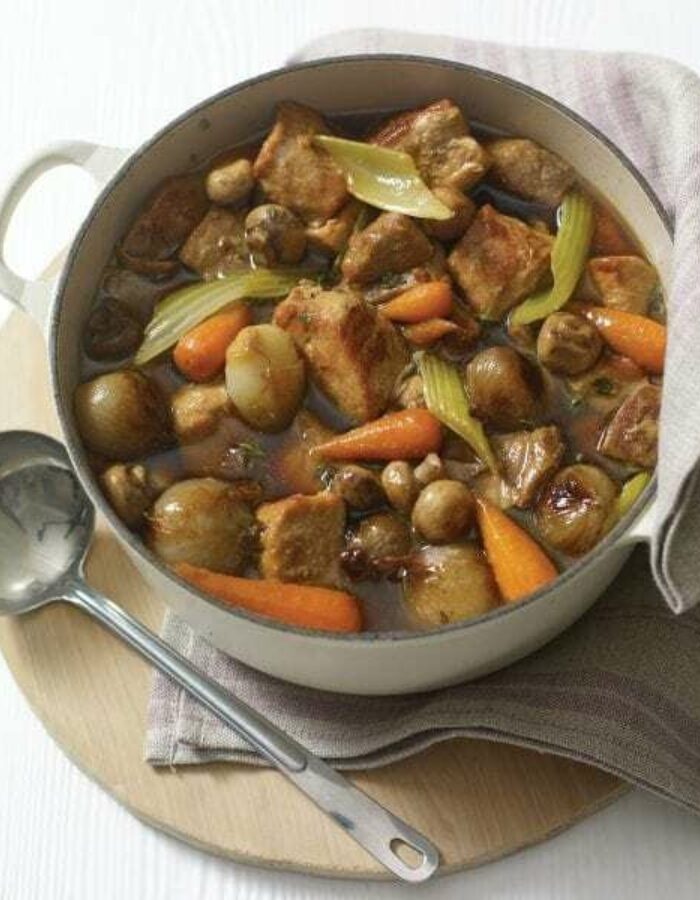 Transfer to a casserole dish (with a fitted lid). Fry the onion, carrots and celery in the pan for 5 minutes until soft.